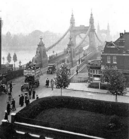 Hammersmith Bridge and the Thames were just steps away from home, and what a vibrant and kaleidoscopic thoroughfare that must have been. Pleasure steamers plying between Kew and Richmond in one direction, or down to Westminster and Greenwich in the other.   Vast steam ships from far-flung exotic shores; grubby tramp ships transporting coke and coal to factories;  heavily laden sailing barges carrying all manner of goods and essentials to the docks, warehouses, pubs and businesses lining the shore; hard-working tugs, like little terriers – worrying and nudging vessels into place or pulling  lines of barges.  Larger map here
